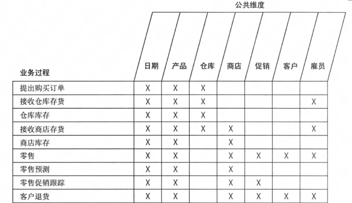 https://blog.csdn.net/u012100548/article/details/123627403(总线矩阵是数仓建设的纲领性文件.总线矩阵包含业务过程、公共一致性维度。每行代表一个业务过程,每列表示一个公共维度,还包括业务过程与维度间的联系,能看清整个数据仓库的数据)