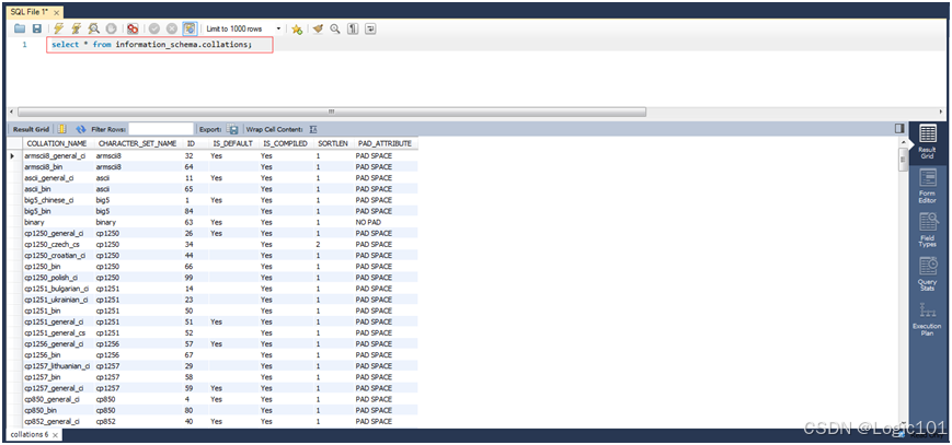 【实验2-6】查看INFORMATION_SCHEMA.COLLATIONS表中的信息。