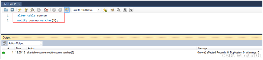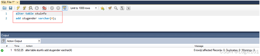 【实验2-11】使用ALTER TABLE语句将stu_info表的表名改为stuinfo,并且增加stugender varchar(4)字段,将course表中courno字段的类型改为varchar(5)。