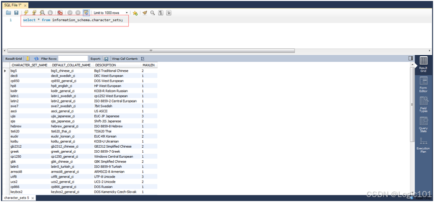 【实验2-5】查看INFORMATION_SCHEMA.CHARACTER_SETS 表中的信息。