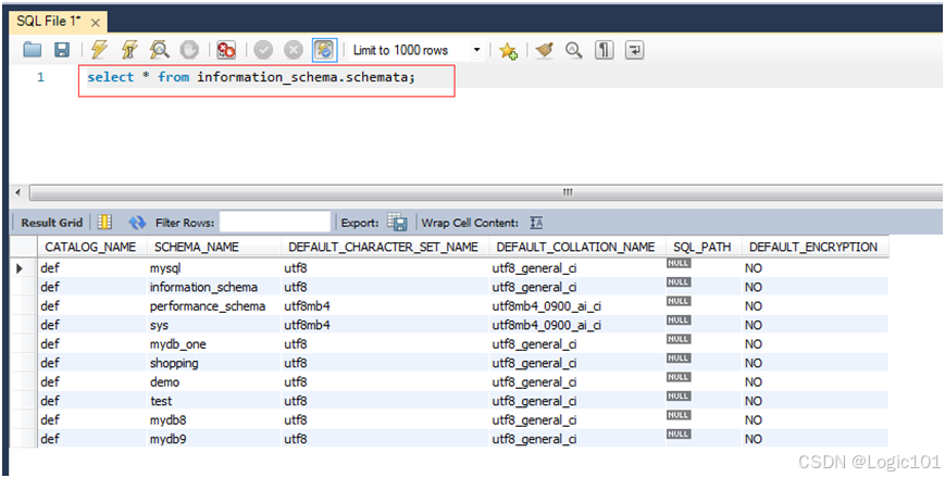 【实验2-1】查看INFORMATION_SCHEMA.SCHEMATA 表中的信息。