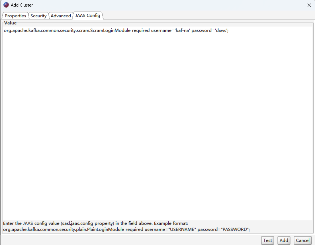 org.apache.kafka.common.security.scram.ScramLoginModule required username='kaf-na' password='dxws';