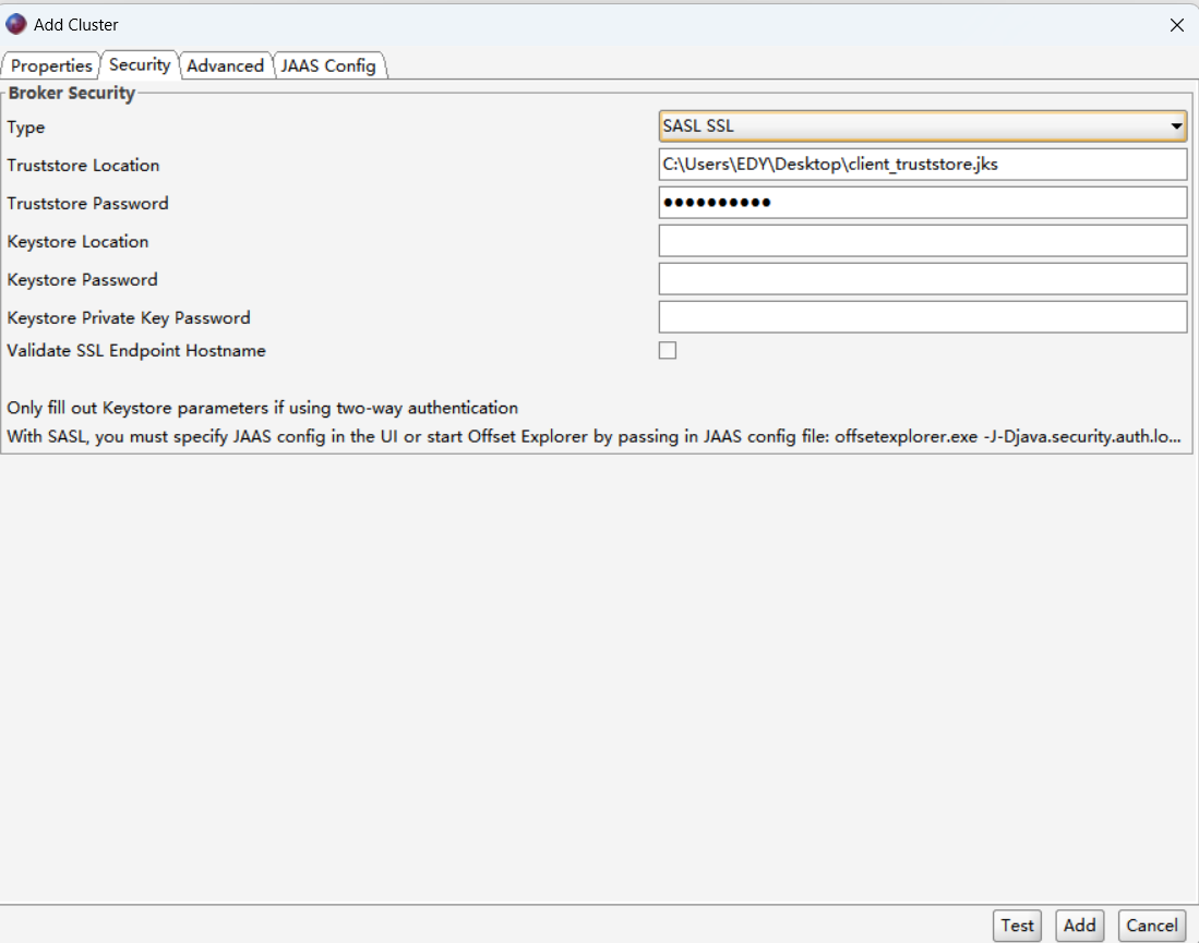 Truststore Password: 属性字段 ssl.truststore.password 对应的值.SpringBoot项目在KafkaConfig 类中找