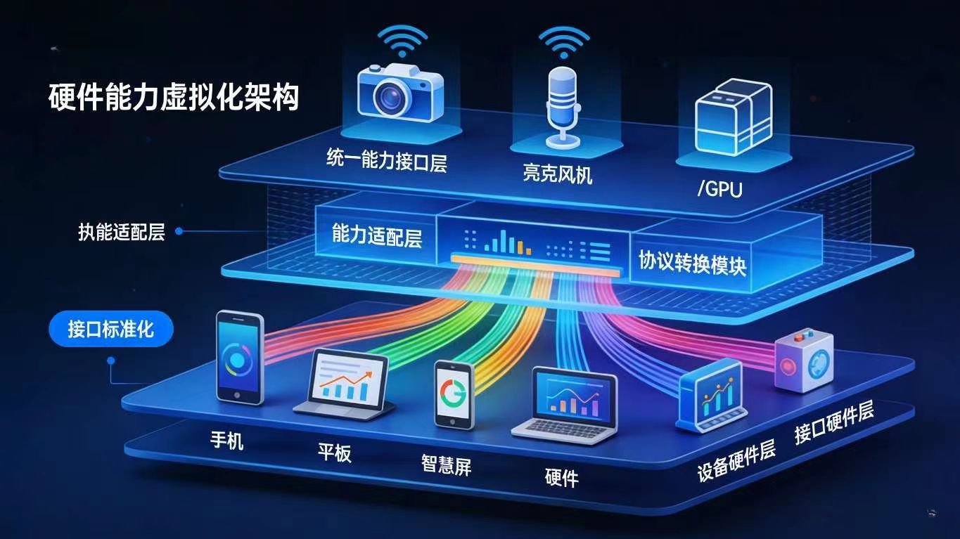 - 能力虚拟化:将不同设备的硬件能力(摄像头、麦克风、GPU)抽象为统一接口,应用按需调用无需关注设备差异;