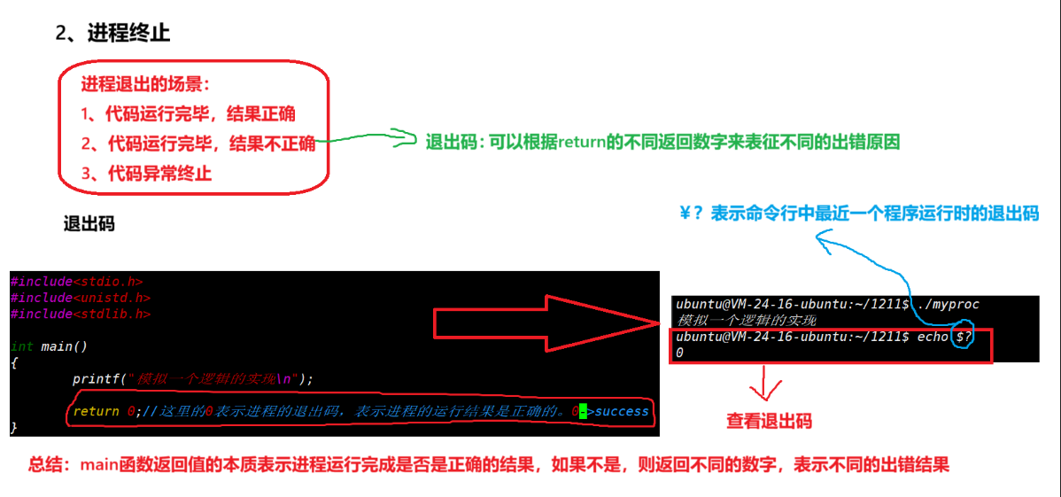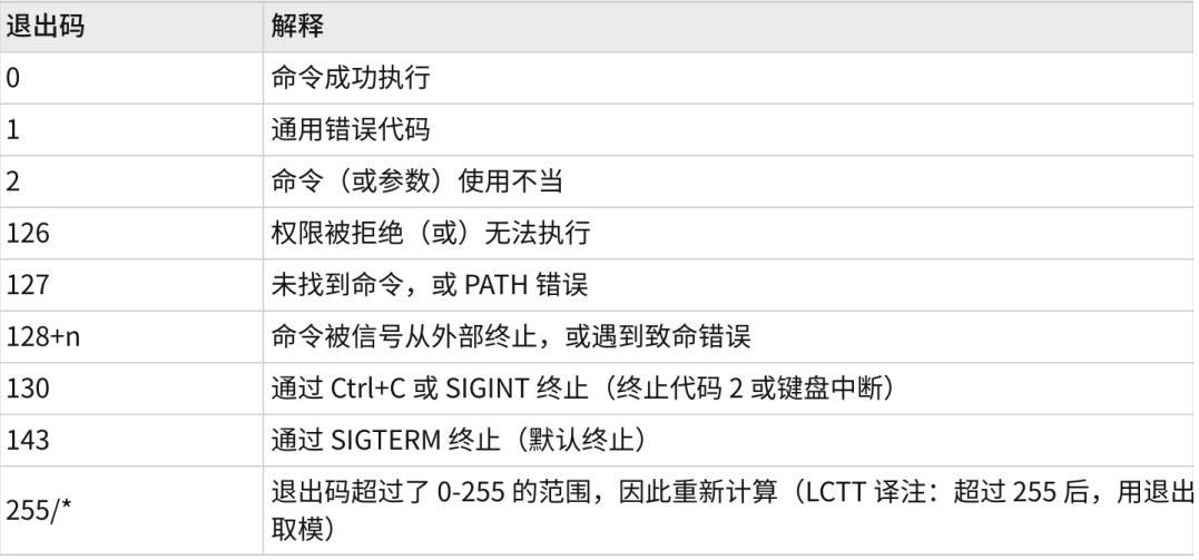 退出码(退出状态)可以告诉我们最后⼀次执行的命令的状态。在命令结束以后,我们可以知道命令是成功完成的还是以错误结束的。其基本思想是,程序返回退出代码0 时表示执行成功,没有问题。代码1 或0 以外的任何代码都被视为不成功