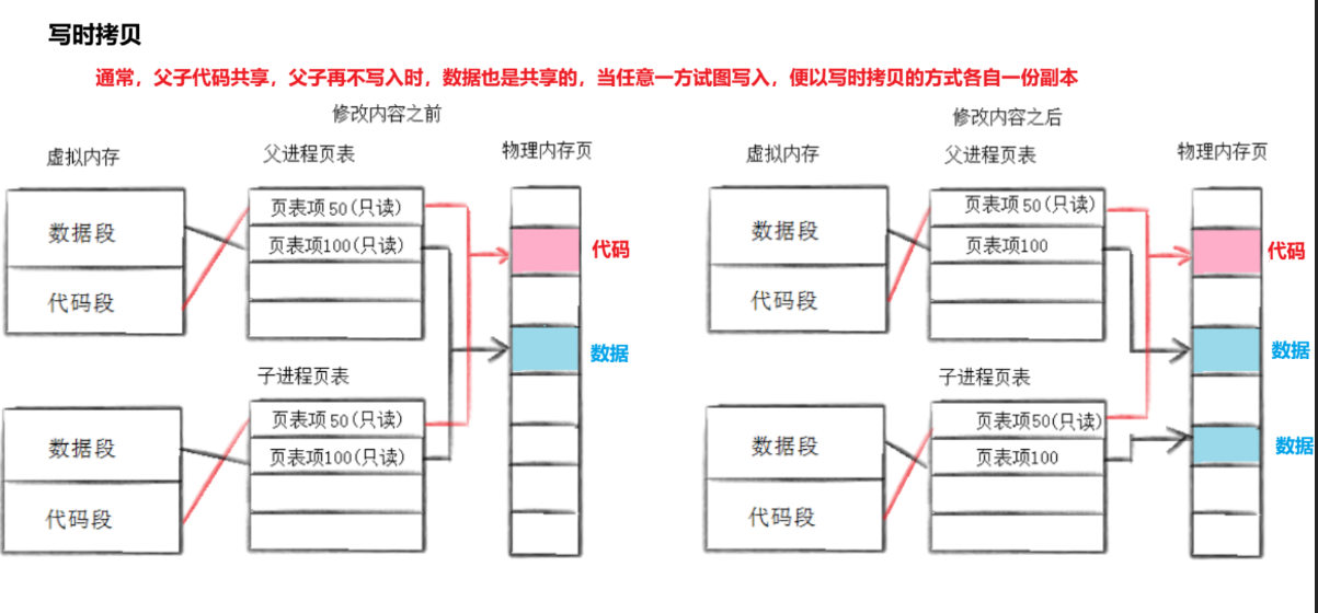 通常,父子代码共享,父子再不写入时,数据也是共享的,当任意一方试图写入,便以写时拷贝的方式各自一份副本