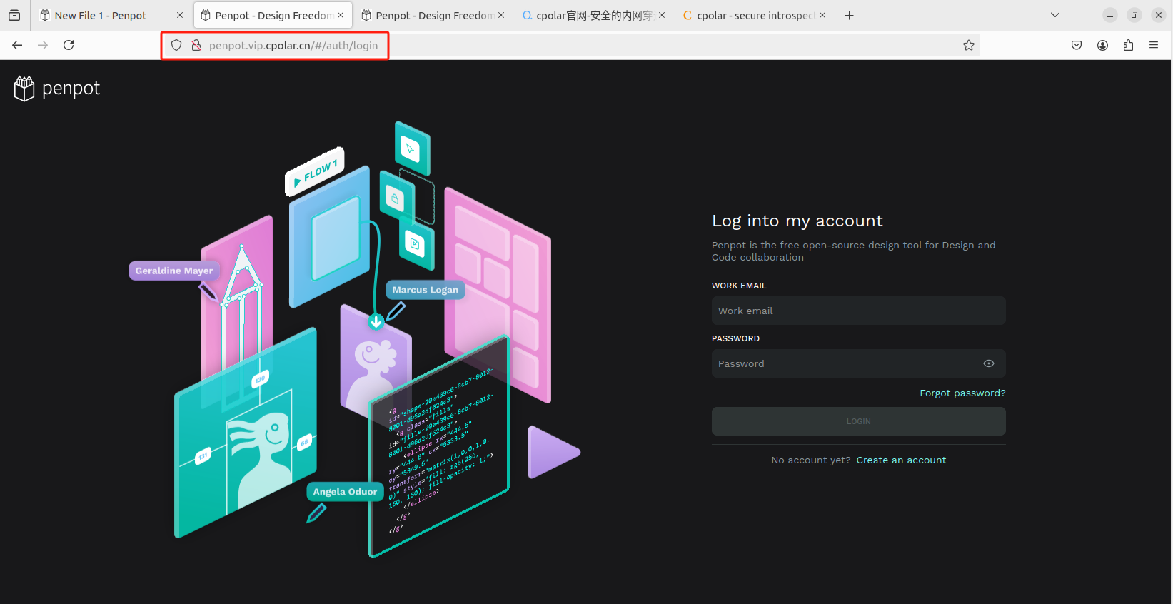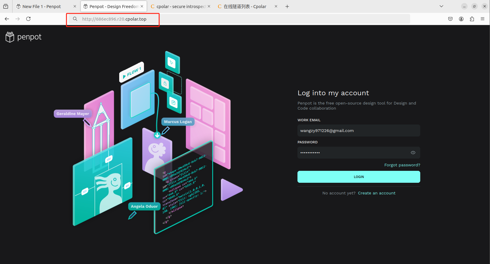如下图所示,成功实现使用公网地址异地远程访问本地部署的Penpot设计创作平台!