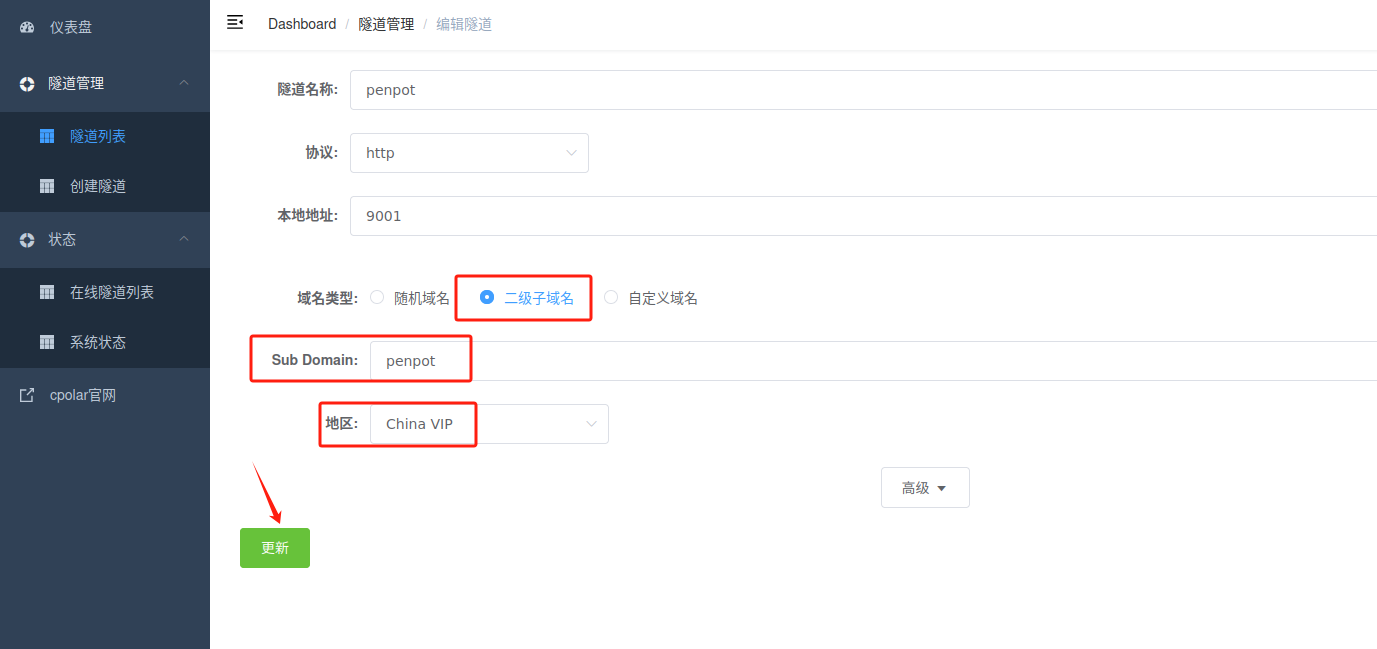 修改隧道信息,将保留成功的二级子域名配置到隧道中