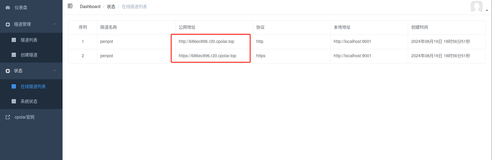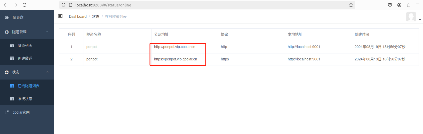 创建成功后,打开左侧在线隧道列表,可以看到刚刚通过创建隧道生成了两个公网地址,接下来就可以在其他电脑(异地)上,使用任意一个地址在浏览器中访问即可。
