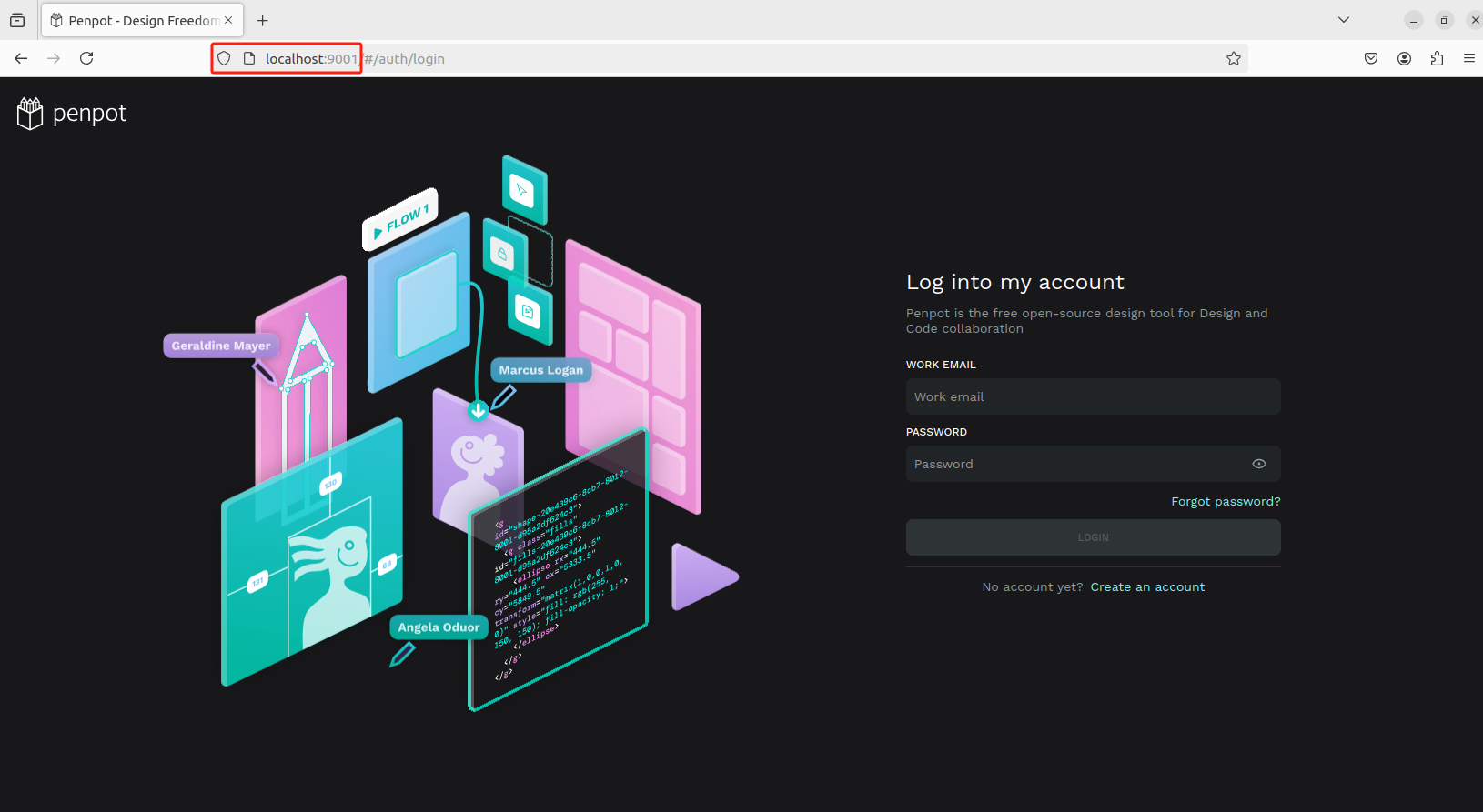 接下来我们就可以通过任意浏览器进行访问测试,打开一个浏览器输入localhost:9001,可以看到进入到了Penpot的登录界面,注册一个用户名和密码。