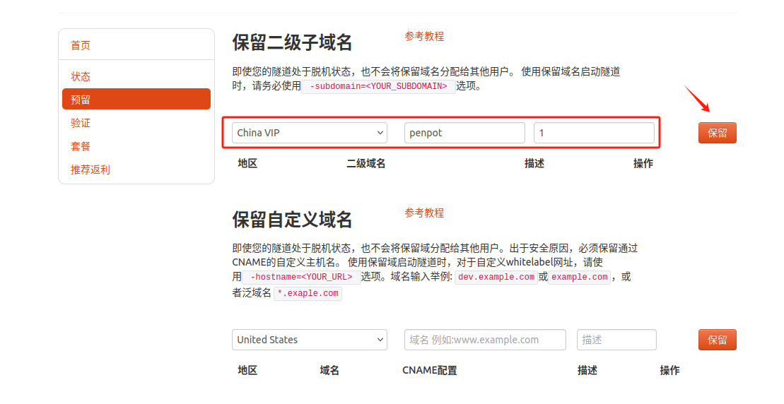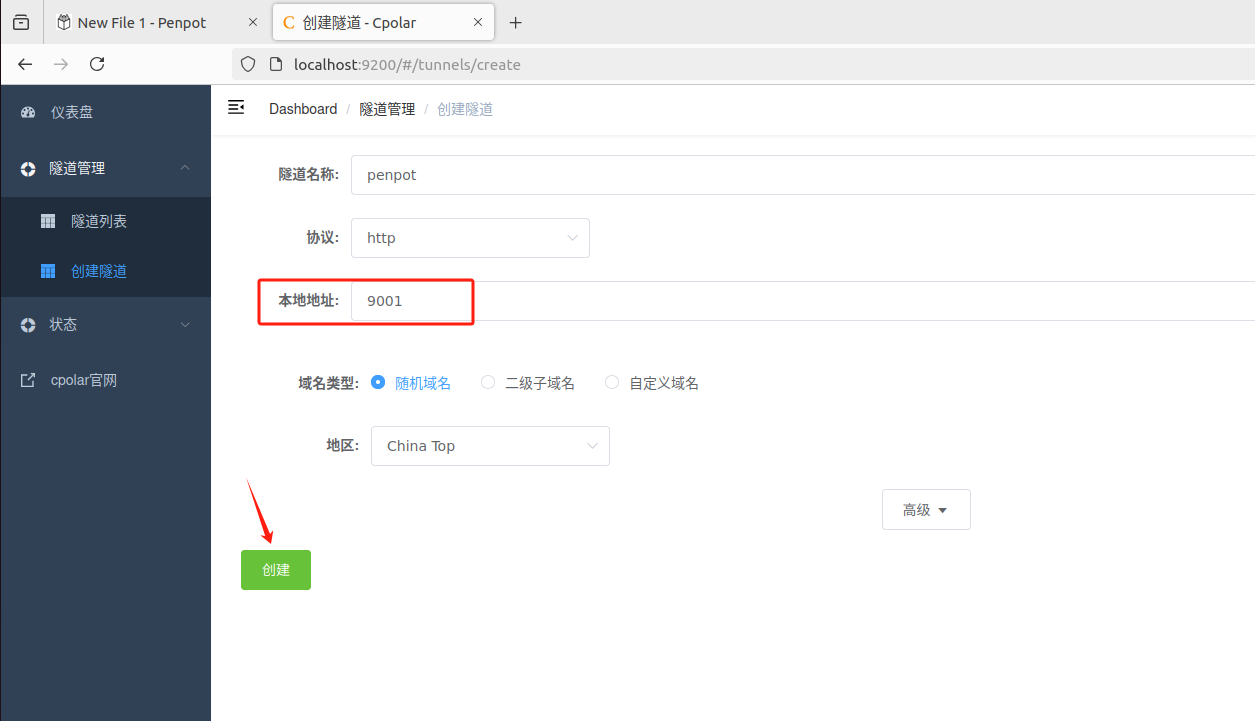 隧道名称:可自定义,本例使用了: Penpot 注意不要与已有的隧道名称重复
