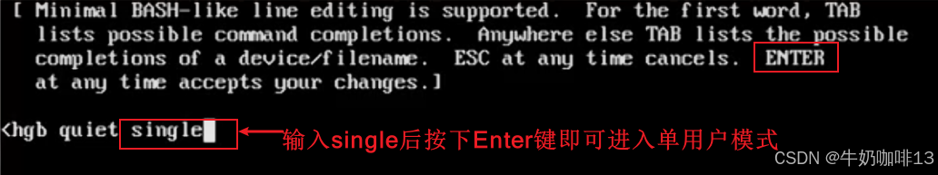 | 1 | CentOS6.X 及其之前的版本 | 《1》系统重启后进入GNU GRUB界面后按下【e】键; 《2》选中【kernel /vmlinuz】开头的内容后按下【e】键进入编辑模式; 《3》然后在末尾(如:quit后面输入【 single】)后按下【Enter键】; 《4》选中【kernel /vmlinuz】开头的内容后按下【b】键进行系统引导进入单用户模式; 《5》修改指定用户密码(如修改root用户密码【passwd root】根据提示输入密码后重启电脑【reboot -f】即可)。