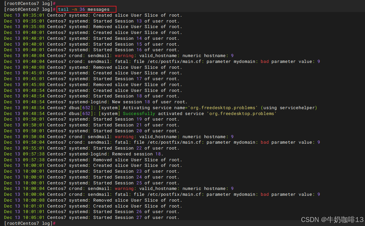 | 1 | /var/log/messages | 公共日志文件,记录Linux内核消息及各种应用程序的公共日志信息,包括启动、 IO错误、网络错误、程序故障等。对于未使用独立日志文件的应用程序或服务,一般都可以从该文件获得相关的事件记录信息。 |