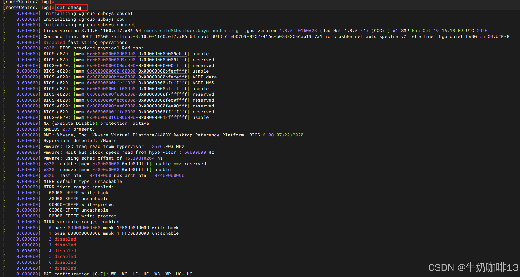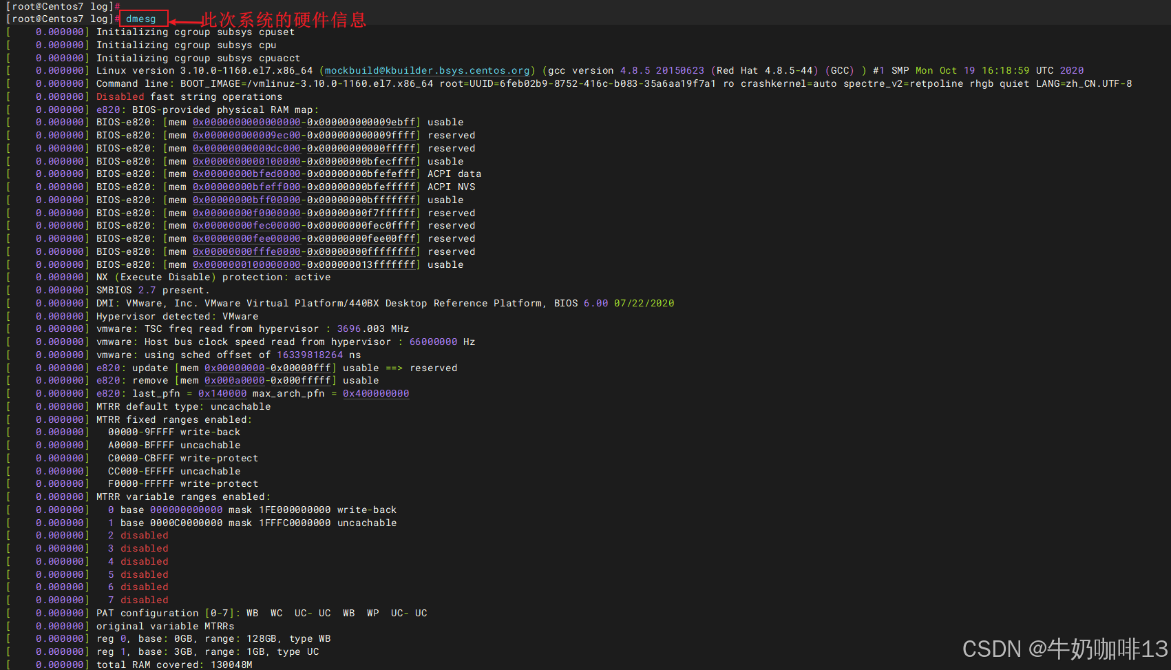 | 3 | /var/log/dmesg | 包含内核缓冲信息(kernel ring buffer)。在系统启动时,会在屏幕上显示许多与硬件有关的信息。此文件记录的信息是系统上次启动时的信息。 而用dmesg命令可查看本次系统启动时与硬件有关的信息,以及内核实时缓冲信息。 |