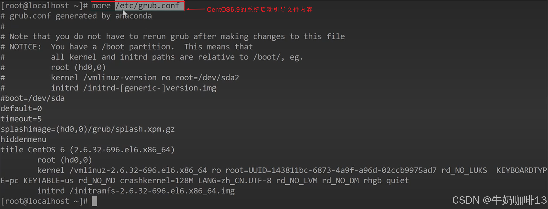 | 6 | root(hd0,0) | 相对下面的内核和initrd全局定义root为第一块磁盘的第一个分区,此处的root不是真的root,而是开机时的/boot 分区,因为bootloader开机还没有加载内核以及/分区。加载的内核需要通过/boot分区加载/分区和内核。 |