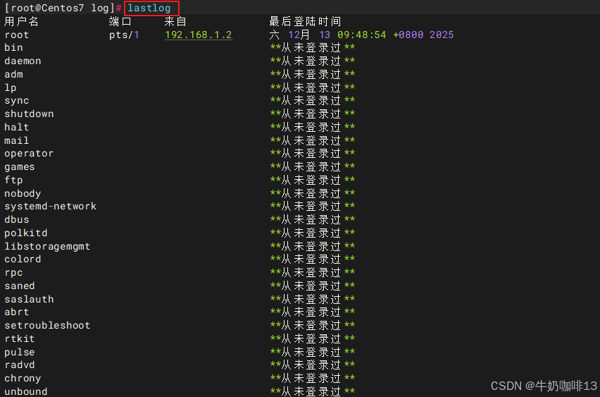 | 9 | /var/log/lastlog | 记录最近成功登录的事件和最后一次不成功的登录事件。可执行【lastlog】命令查看。 |