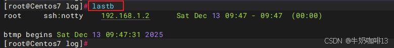 | 8 | /var/log/btmp | 记录错误登录进入系统的日志信息,可执行【lastb】命令查看(也是一个二进制文件)。 |
