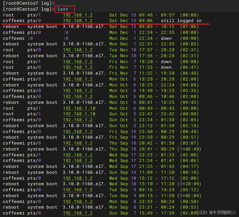 | 7 | /var/log/wtmp | 记录系统所有登录进入和退出纪录。 可执行【last】命令查看 (注意:该文件是一个二进制文件,只能通过last命令查看) |