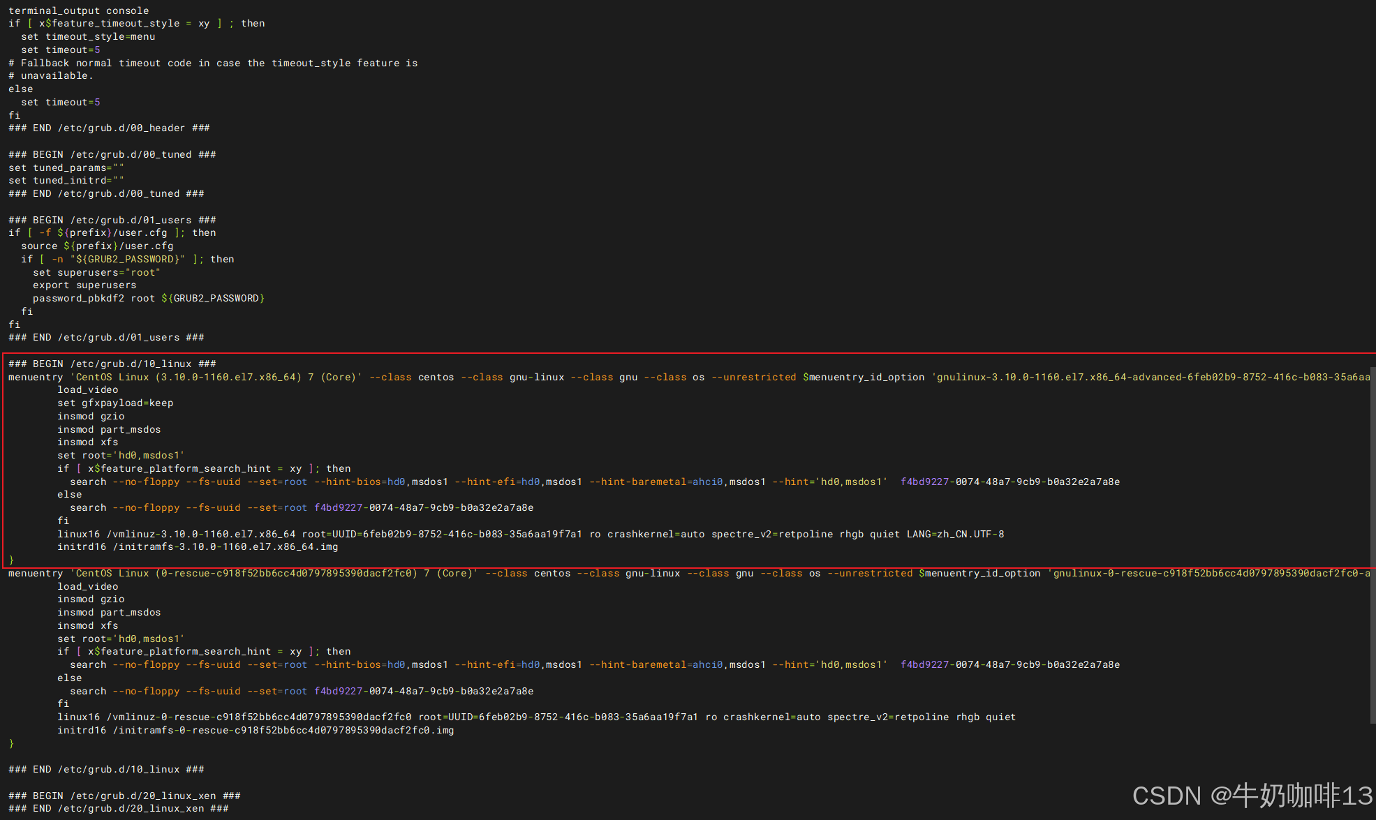 | 1 | default=0 | 定义了没有选择内核菜单的启动项时选择第一个内核启动。 |