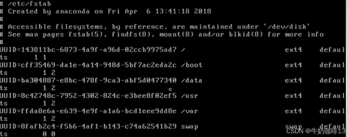【/etc/fstab】文件存放了系统中文件系统的相关信息,在linux启动时,系统会读取此文件,自动挂载linux的各个分区,如果此文件配置错误,或者丢失,就会导致系统无法启动,具体的故障现象是在检测mount partition时出现(如:starting system logger;或者启动到一部分没有反应停止了无法正常进入系统中)。