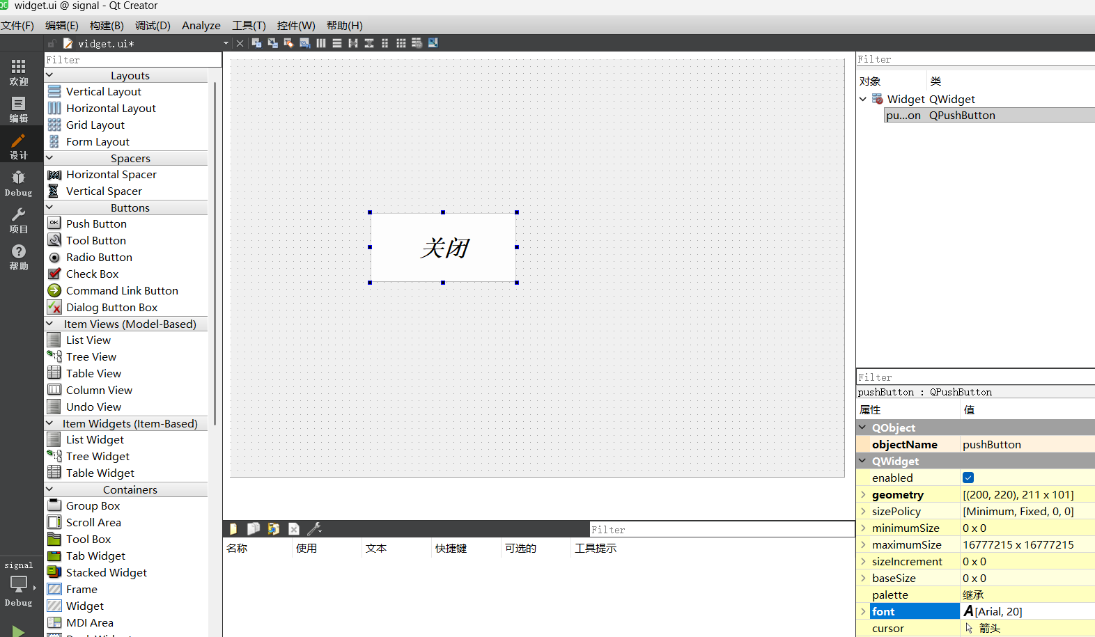 3、在 UI 设计窗⼝点push Button中拖⼊⼀个 "按钮" ,并且修改 "按钮" 的名称及字体⼤⼩等;