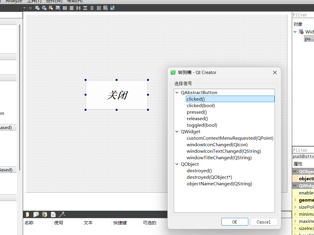我们不仅可以直接使用QT内置的槽函数,也可以通过可视化的方式生成槽函数。然后在我们触发按钮信后时,QT会通过控件的 objectName 属性找到该按钮控件所对应的该信号处理函数。