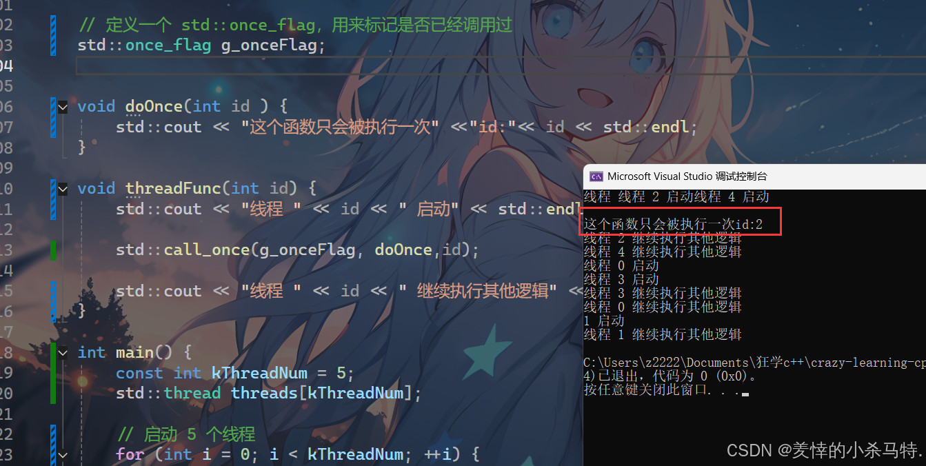 在 C++ 中,std::call_once是 头文件提供的一个工具,用来保证多个线程中只有一个线程会执行某个函数,其余线程会跳过。它的典型用法是配合 std::once_flag一起使用。