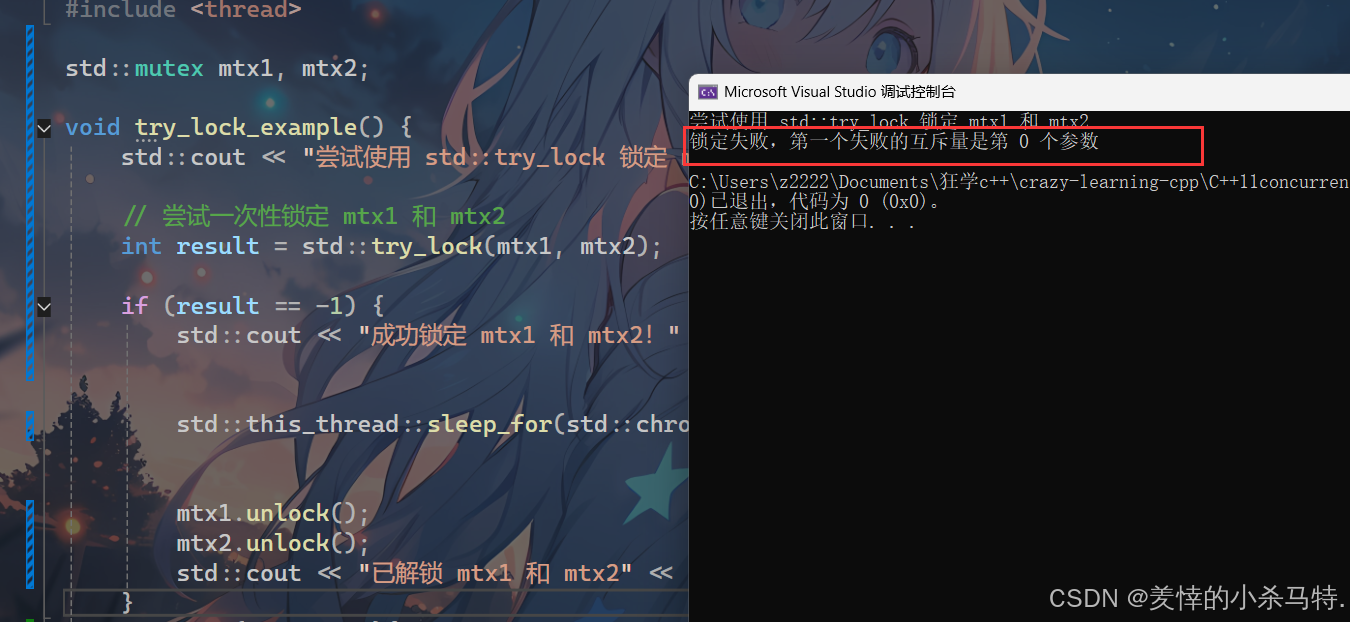 try_lock会先把已经成功锁定 的那些锁对象解锁,然后返回第一个锁定失败的对象的下标 (下标从 0开始计数,且以"第一个传入的参数对象"为第 0 个)。