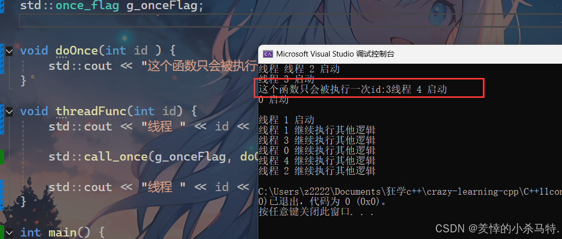 - 这里当第一个线程进入call_once;就会把对应g_onceFlag给标记上,然后去执行对应函数,然后当之后的线程来的时候发现被标记了,就不会执行了。