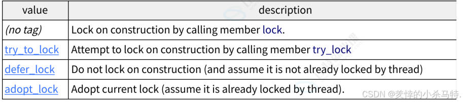 (no tag):构造时通过调用成员函数lock()来加锁。try_to_lock:构造时通过调用成员函数try_lock()尝试加锁(若锁已被其他线程占用,则不会阻塞,直接返回尝试结果)。defer_lock:构造时不进行加锁操作(前提是假设当前线程并没有持有该锁,否则发生未定行为。)。adopt_lock:构造时"接管"当前已经持有的锁(前提是假设当前线程已经持有了该锁,否则发生未定行为。)。