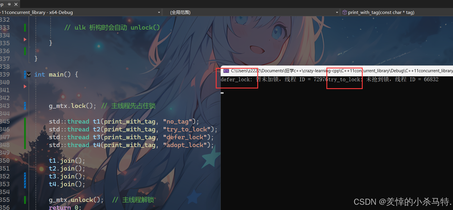 - 这里主线程加上锁;然后让那四个子线程去跑设置对应标签的函数;这里必然有no_tag标签的一定阻塞;然后adopt_lock的前提必须保证自己加上锁;因此也会阻塞住;而try_to_lock的就不阻塞,发现自己无锁执行对应逻辑,defer_lock开始等待锁到来。(因此效果看到的不是try_to_lock打印对应逻辑就是defer_lock打印对应逻辑)。