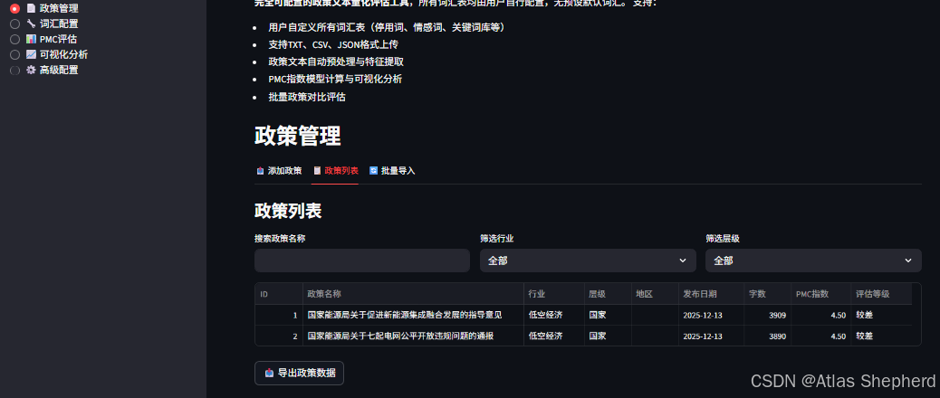 基于python构建的一个完整的PMC(Policy Measurement and Comparison)政策文本量化评估系统,使用Streamlit UI。