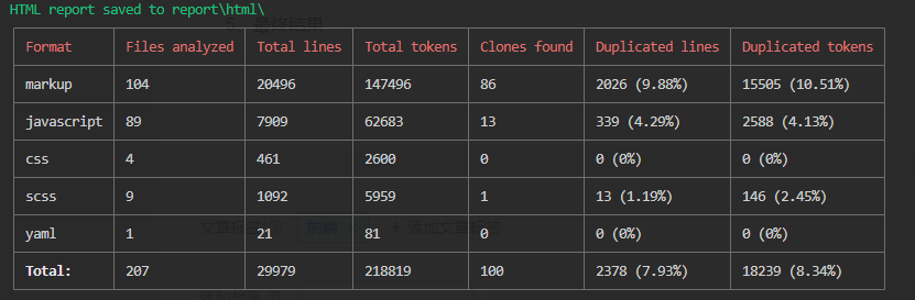 - Clone found (javascript):显示找到的重复代码块,这里是javascript文件。并且会显示重复代码在文件中具体的行数,便于查找。