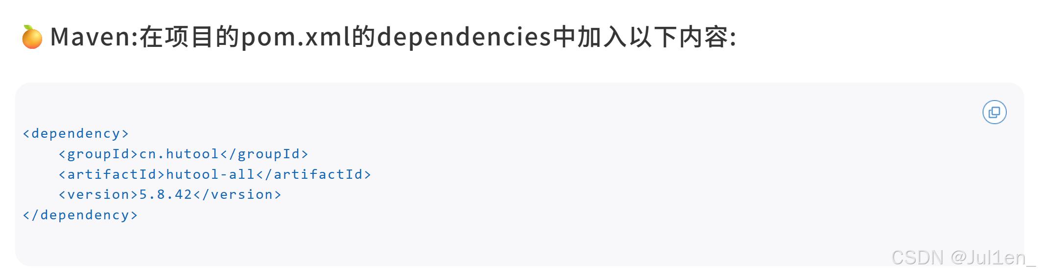 Hutool工具是一个开源的Java工具依赖库,封装了许多功能,访问https://hutool.cn,按图中引入依赖即可使用,具体功能可查看官方文档~