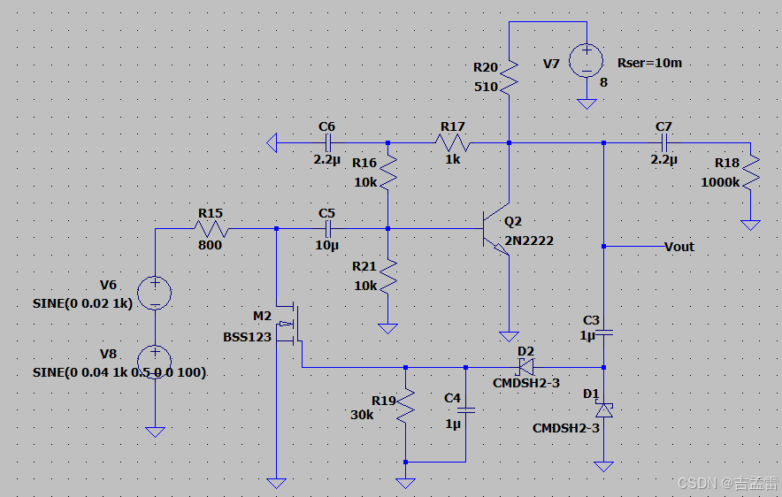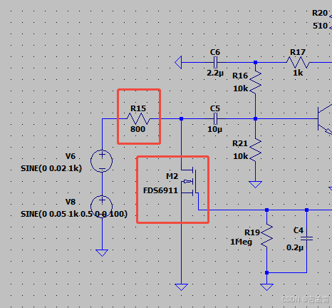 下面的AGC电路先输入Vp=20mV,1k的正弦波,delay 0.5s后输入Vp=60mV,AGC的过程为:当输入Vp开始增大后,整流滤波后到M2栅极的直流电压开始增大,直到mos开启到可变电阻区,M2的Rds开始和R15的电阻分压,降低输入信号的幅度。在整流滤波中D1和D2都比较重要,不能用电阻替代,D1钳位输出到一个负的管压降,D2做整流滤波。