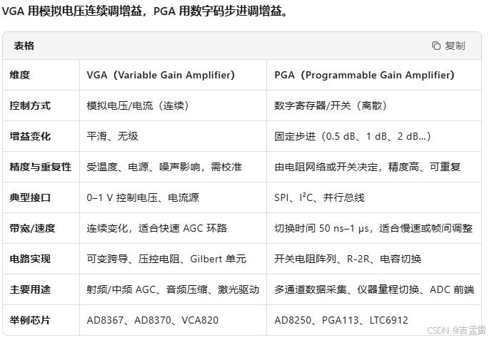 PGA的作用与VGA类似,下面为AI总结的差异,主要体现在控制方式、增益变化形式、带宽。
