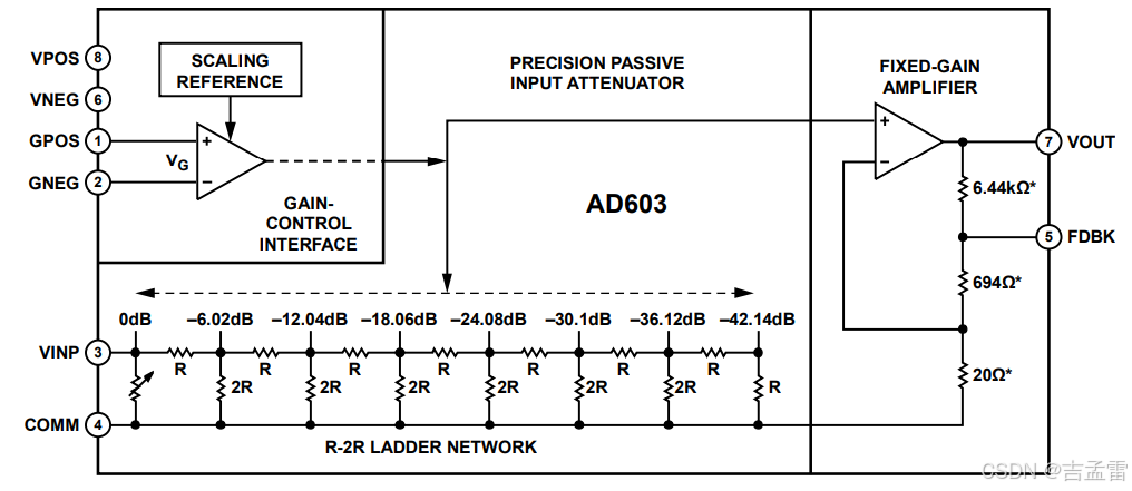 也可以用专用的VGA芯片实现可变增益,下图为VGA芯片AD603的内部框图,GPOS的输入电压控制VINP信号的衰减,衰减网络由R-2R构成。