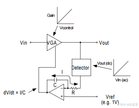 自动增益控制的目的是最优的利用模拟前端AFE输入级和放大器的动态范围和信号处理能力。构成自动增益控制包括可变增益放大器VGA、幅度检测Detector(整流滤波)、误差放大等三部分组成。