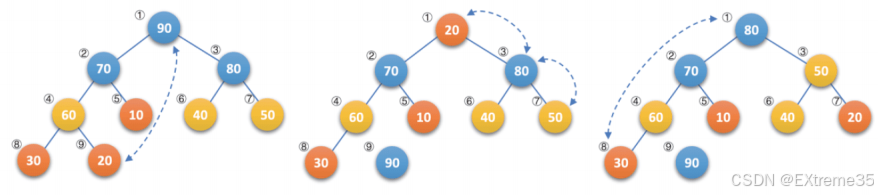 例如下图所示,图1是一个大顶堆 ,90为最大值,将90与20(末尾元素)互换,如图2所示,此时90就成了整个堆序列的最后一个元素,也就是逻辑删除,将20经过下沉调整,使得除90以外的结点继续满足大顶堆定义(所有结点都大于等于其孩子),见图3,然后再考虑将30与80互换......