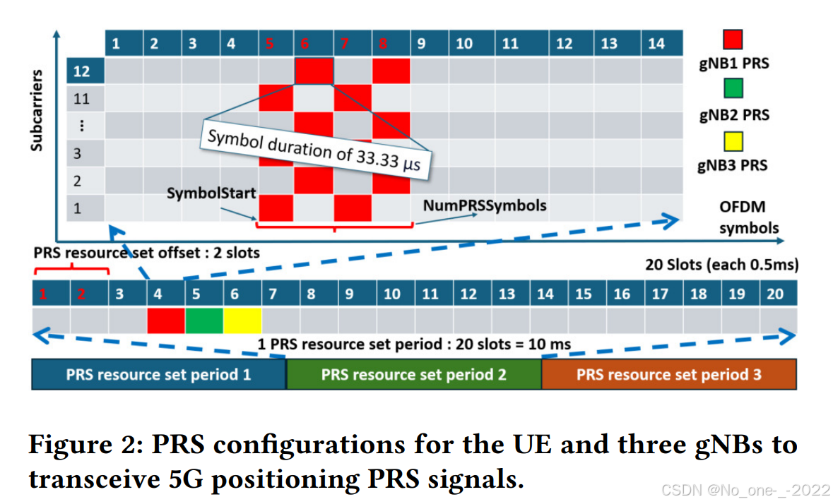 图 2 提供了 PRS 配置的图解表示,其中包括 20 20 20 个时隙的 PRS 资源集周期 和 2 2 2 个时隙的 PRS 资源集偏移 ,分别为 gNB1、gNB2 和 gNB3 设置的 1 1 1、 2 2 2 和 3 3 3 个时隙的 PRS 资源偏移 ,每个 PRS 资源的 PRS 资源重复 为 1 1 1,以及 1 1 1 个时隙的 PRS 资源时间间隔。