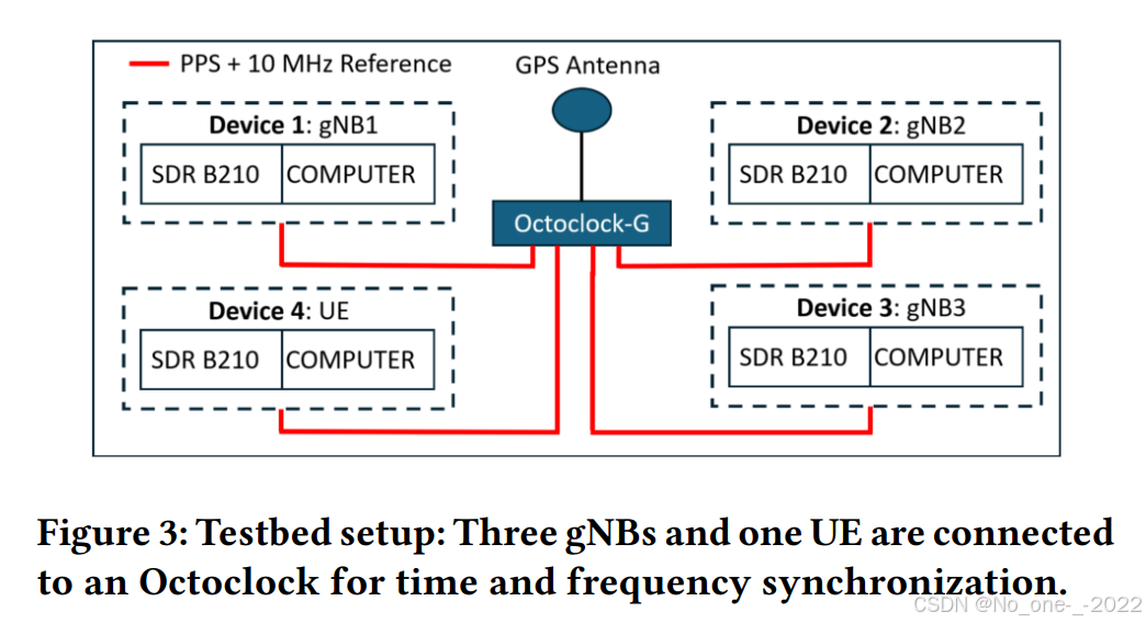 在每个设备中,计算机运行着开源的、符合 3GPP 标准的 5G PHY 层软件协议栈 ------ OAI [12],并且每个设备都可以配置为作为 UE 或 gNB 运行。我们将其中一个设备配置为 UE,而将其余三个设备配置为 gNB。我们将在建立系统的数学模型之后,在 5.1 节中对测试平台进行进一步的讨论。