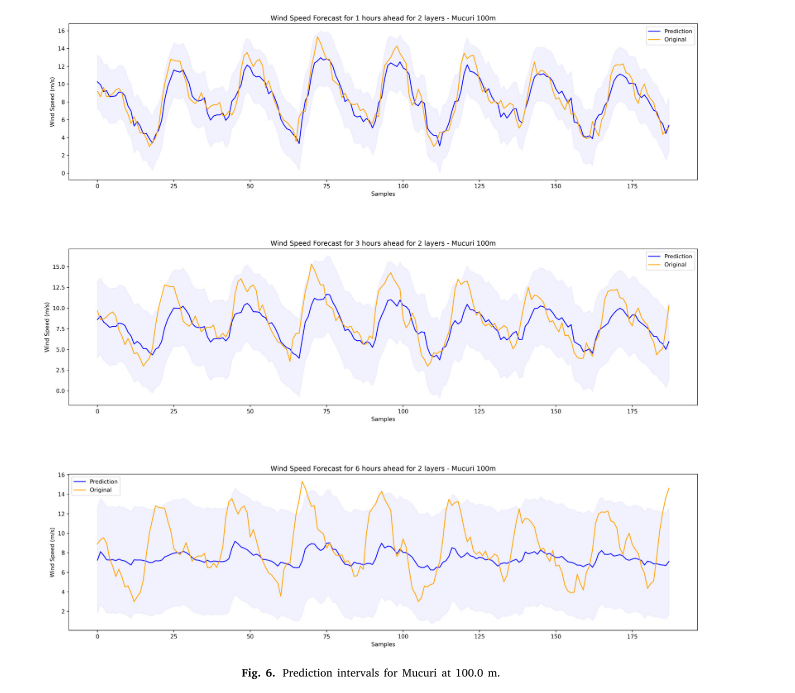 展示了 Mucuri 地区 100m 高度处,使用 2 层 Ansatz 的 QNN 模型对未来 1小时、3小时和 6小时风速的预测区间与实际值的对比,显示出模型能够很好地捕捉风速的波动趋势。