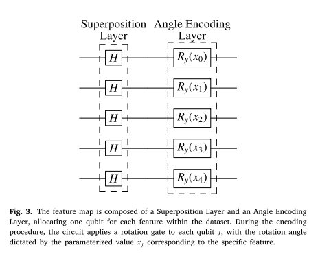 特征映射电路图。左侧为叠加层(H门),右侧为角度编码层( R y ( x ) R_y(x) Ry(x)),为数据集中的每个特征分配一个量子比特