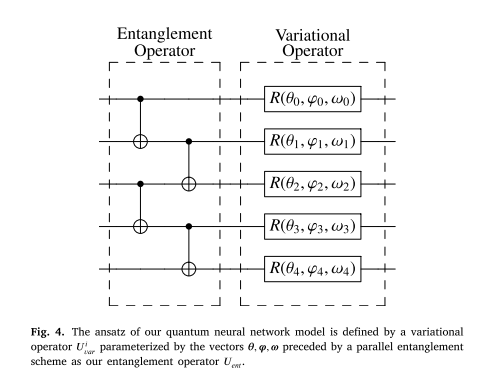 量子神经网络模型的Ansatz结构。展示了由参数化向量 θ , ϕ , ω \theta, \phi, \omega θ,ϕ,ω 定义的变分算符 U v a r U_{var} Uvar,以及其前置的并行纠缠算符 U e n t U_{ent} Uent