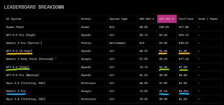 long cot 推理本来就是rl训练提升的一个关键能力,不能因为gpt-5.2的推理token长就认为它作弊,long cot推理正确才是首要目的,效率逐步优化。而且从效率角度来评估,arc-agi-2 leaderboard的y轴为score,x轴为成本,本身就考虑了成本效率因素。gpt-5.2 high的分数是43.3%,成本是$1.39/task,效率用分数除以成本≈31.15,而gemini 3 pro分数为31.3,陈本为0.811,效率38.38,效率比=38.38/31.15≈1.23,如果考虑arc-agi-2的难度系数,gpt-5.2大概率比gemini3更具推理效率。