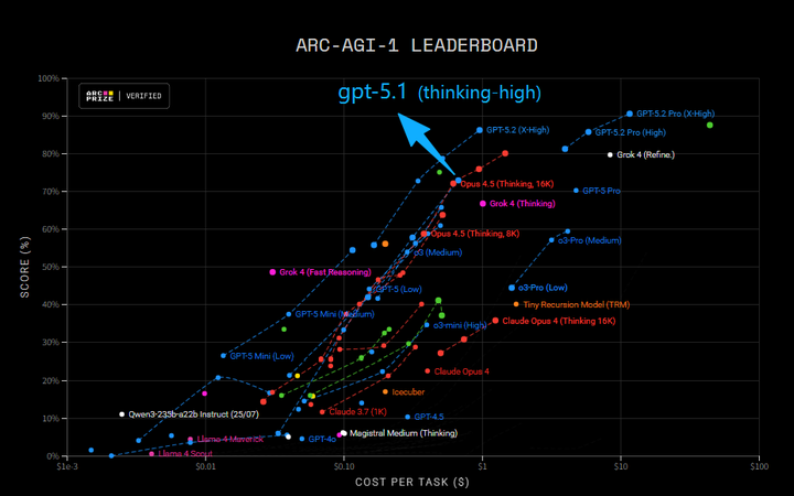 GPT5.2发布后,在多个公开benchmark上都相较于5.1有了不小提升,分享其中看到比较有意思的一个点。gpt-5.2在ARC‑AGI‑2提升非常大,而gpt-5.1-thinking在这个测评上分数才达到17.6[1],比opus-4.5(22.8)低5个点,与gemini-3-pro(31.1)差距巨大, 我当时看到这个指标一度怀疑是不是看错了。