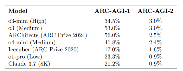 那了解arc-agi测评什么能力之后,我们来看一下arc-agi-2和arc-agi-1有什么比较大的区别?导致gpt-5.1在两代测评集上出现如此大的反差表现。根据arc-agi-2的技术报告,arc-agi-2在5月份发布时,当时最强的o3-mimni(High)模型在arc-agi-1上实现了34.5的成绩,而在arc-agi-2上只达到3.0%,但是却是表现最好的模型,claude-3.7(8k)只有0.9%,而在arc-agi-1上,claude-3.7也有21.2%[3]。