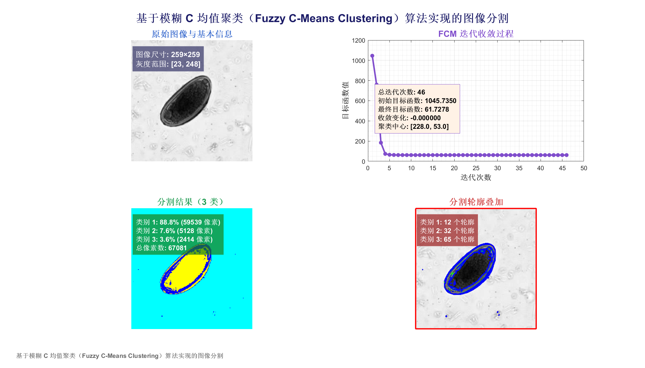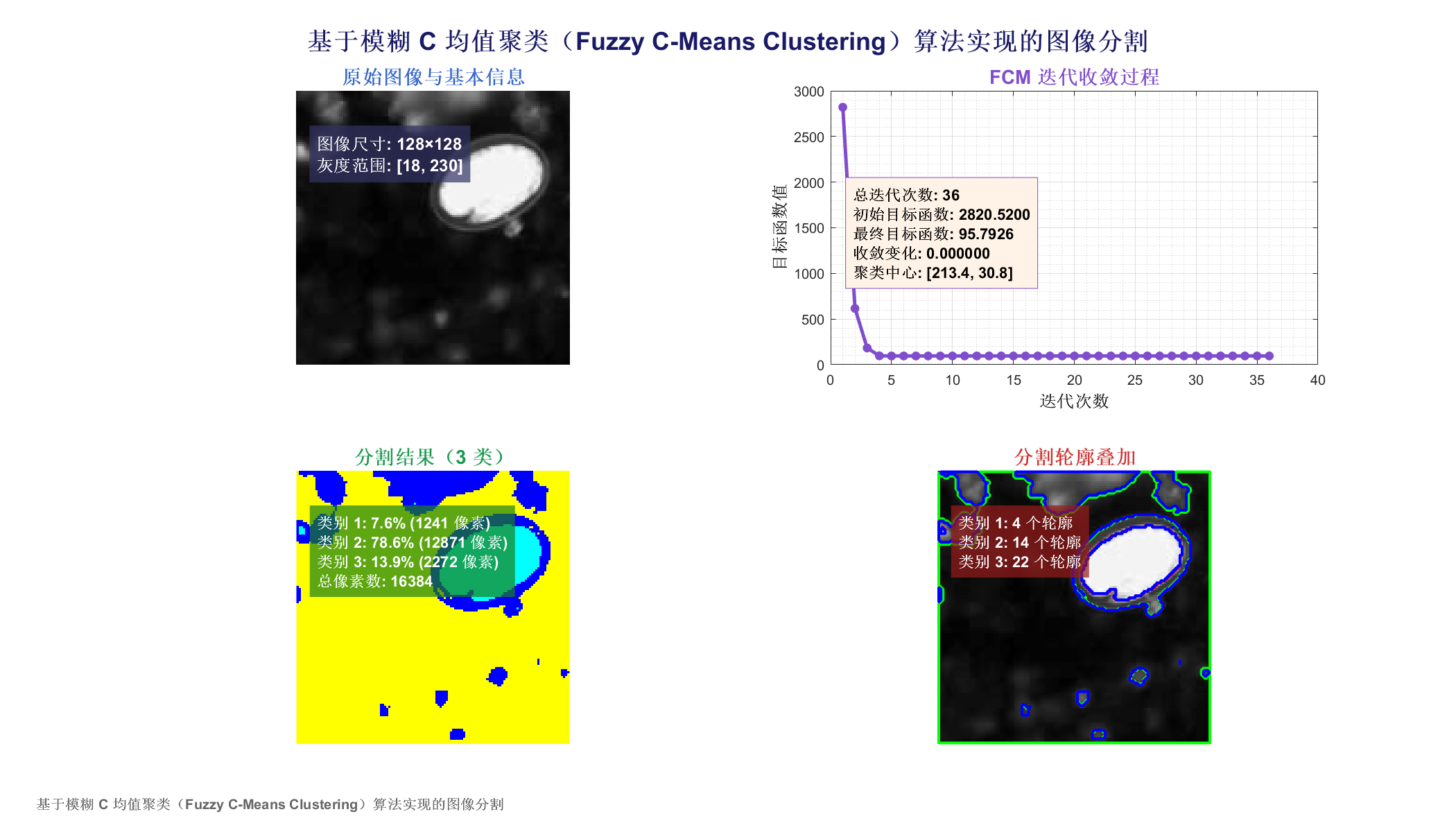 迭代结束后,对优化后的模糊矩阵进行清晰化处理:对于每个像素点 xkx_kxk ,将其归入隶属度最大的类别,即若 ui0k=max1≤i≤cuiku_{i_0 k} = \max_{1 \leq i \leq c} u_{ik}ui0k=max1≤i≤cuik ,则将 xkx_kxk 划分到第 i0i_0i0 类,从而实现图像分割。