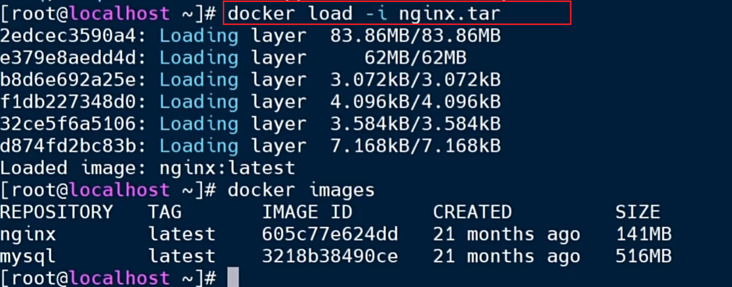 |nginx:latest| 要导出的镜像(仓库:标签) |4.还原镜像docker load -i nginx.tar