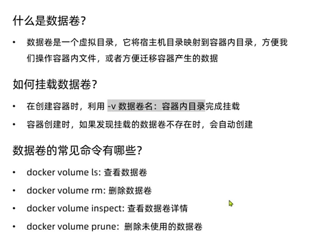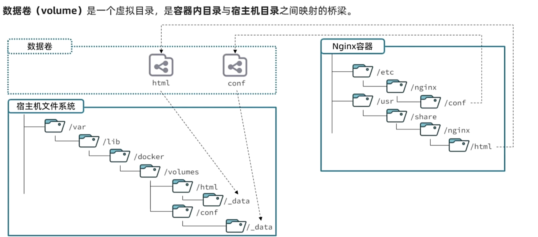 "数据卷就是 Docker 在宿主机上自动开辟的一块专属目录,容器启动时把它'挂靠'到容器里的某个路径,两边对同一块磁盘读写,实现数据持久化 + 实时共享。"